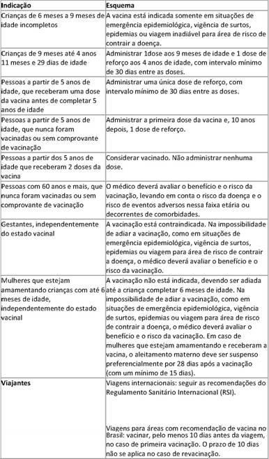 A vacinação contra febre amarela segue critérios recomendados pelo Programa Nacional de Imunizações. O Ministério da Saúde alerta que, nos casos de pacientes com imunodeficiência, a administração da vacina deve ser condicionada à avaliação médica de risco-benefício. Pessoas com histórico de reação alérgica a substâncias presentes na vacina (ovo de galinha e seus derivados, gelatina e outros produtos com proteína bovina), além de pacientes com histórico anterior de doenças do timo (miastenia gravis, timoma, ausência de timo ou remoção cirúrgica) também devem buscar orientação profissional.