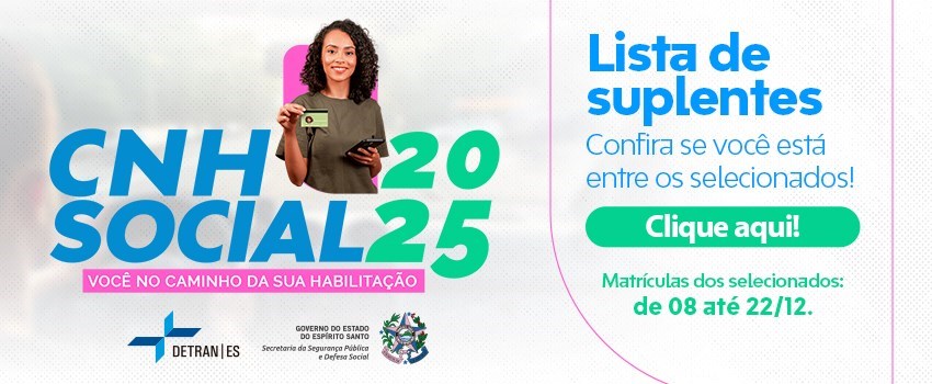 Atenção! Oportunidade para 1.250 candidatos à habilitação pelo programa CNH Social. O Departamento Estadual de Trânsito do Espírito Santo (Detran|ES) divulgou, nesta segunda-feira (08), a lista com os candidatos suplentes na segunda fase do programa CNH Social 2025. Esses são novos contemplados, que não foram selecionados inicialmente, mas que, agora, podem garantir a carteira de habilitação de forma gratuita por meio do programa. Confira a lista de suplentes.