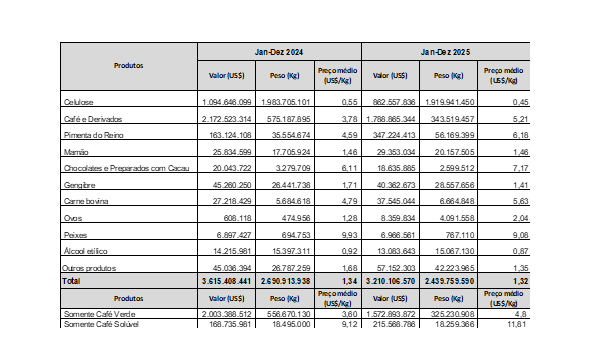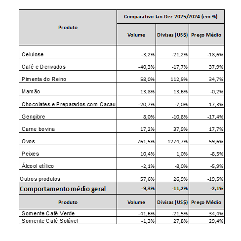 O grande destaque de 2025 foi a pimenta-do-reino, que cresceu 113% em valor e 58% em volume, atingindo US$ 347 milhões, o maior valor da história do produto no Estado. O Espírito Santo respondeu por 69% de todas as exportações brasileiras de pimenta, consolidando sua liderança nacional.