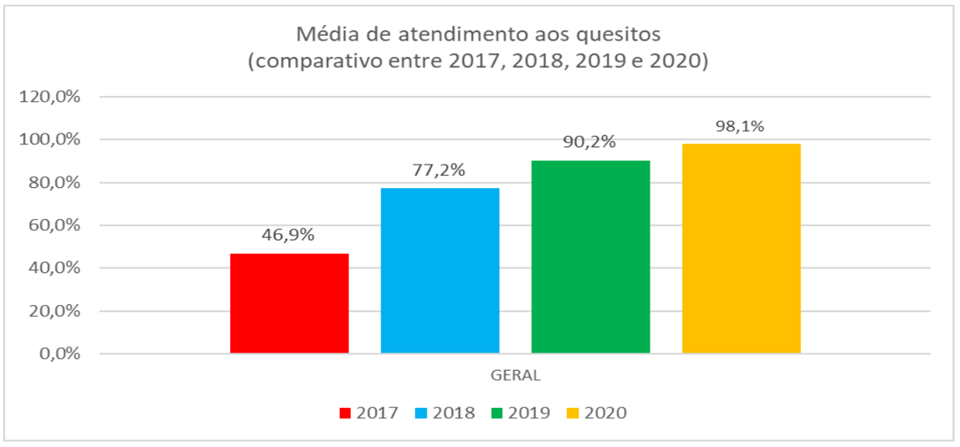 Entre os órgãos avaliados, 96% obtiveram classificação “A”, com pontuação de 94% a 100%; e 4%, “B” (75% a 93%). A avaliação mostra a evolução na transparência dos dados no Estado: em 2017, quando foi realizado o primeiro estudo, a média de atendimento aos quesitos da LAI foi de 46,9%. Em 2018, passou para 77,2%; em 2019, para 90,2%; e agora, em 2020, chegou a 98,1%. Entre os 56 órgãos avaliados, 31 obtiveram a nota máxima, cumprindo 100% dos quesitos.