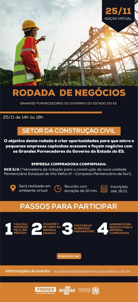 A rodada de negócios será voltada para a construção civil e contará com a participação da empresa GCE/SA, vencedora da licitação para a construção da nova unidade Penitenciária Estadual de Vila Velha VI – Complexo Penitenciário de Xuri. Na ocasião, as empresas capixabas terão a oportunidade de apresentar o portfólio de produtos e serviços, que atendam às demandas apresentadas pela GCE.