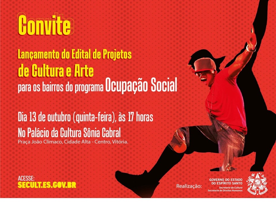 Na próxima quinta-feira (13), as Secretarias de Estado de Direitos Humanos (SEDH) e de Cultura (Secult) vão lançar o edital para selecionar projetos de cultura e arte, no valor total de R$ 1 milhão. O evento será realizado no Palácio da Cultura Sônia Cabral, no Centro de Vitória, às 17 horas.