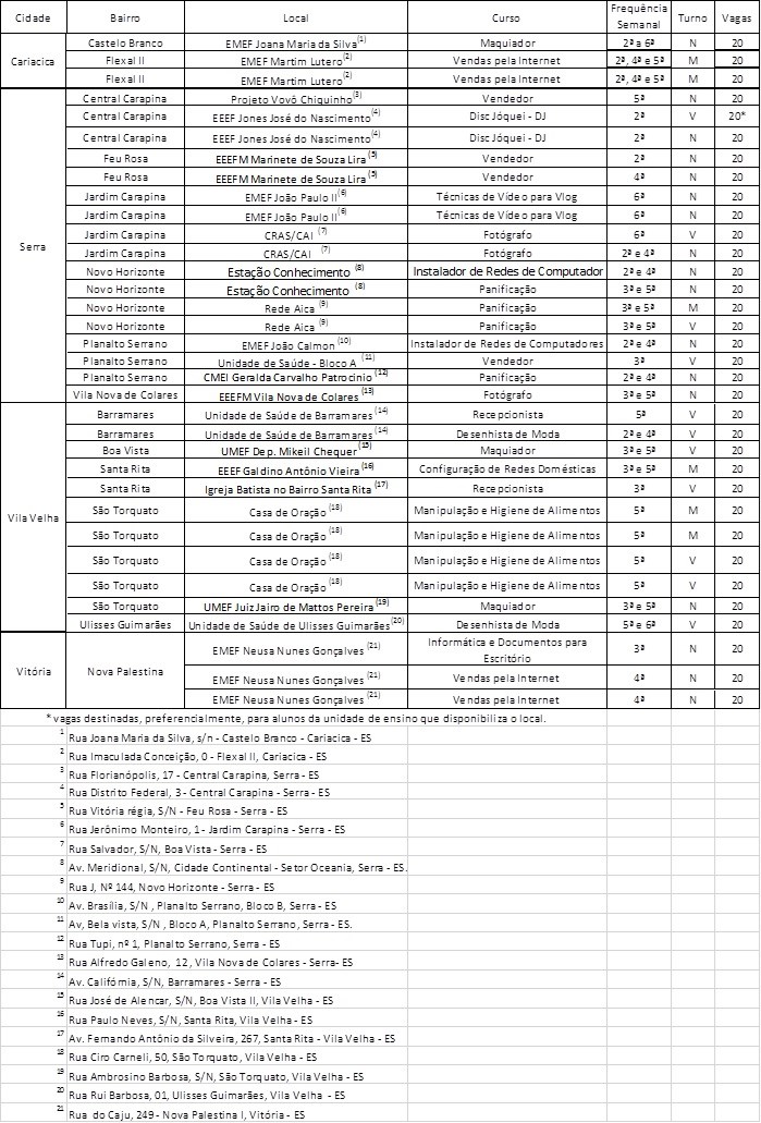 Os cursos, as vagas, os turnos, a frequência semanal e os locais de realização estão na tabela abaixo. Informações adicionais poderão ser solicitadas pelo e-mail ocupacaosocial@sedh.es.gov.br