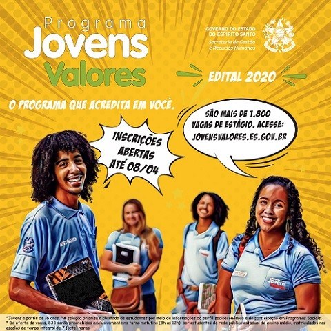 Estão abertas as inscrições para o cadastro geral do programa Jovens Valores. Ao todo, serão ofertadas 1.835 vagas de estágio em 2020. Para concorrer, o candidato precisa ter, no mínimo, 16 anos de idade, estar matriculado e frequentando regularmente uma instituição de ensino e não possuir vínculo empregatício. O cadastro deve ser efetuado pelo site www.jovensvalores.es.gov.br.