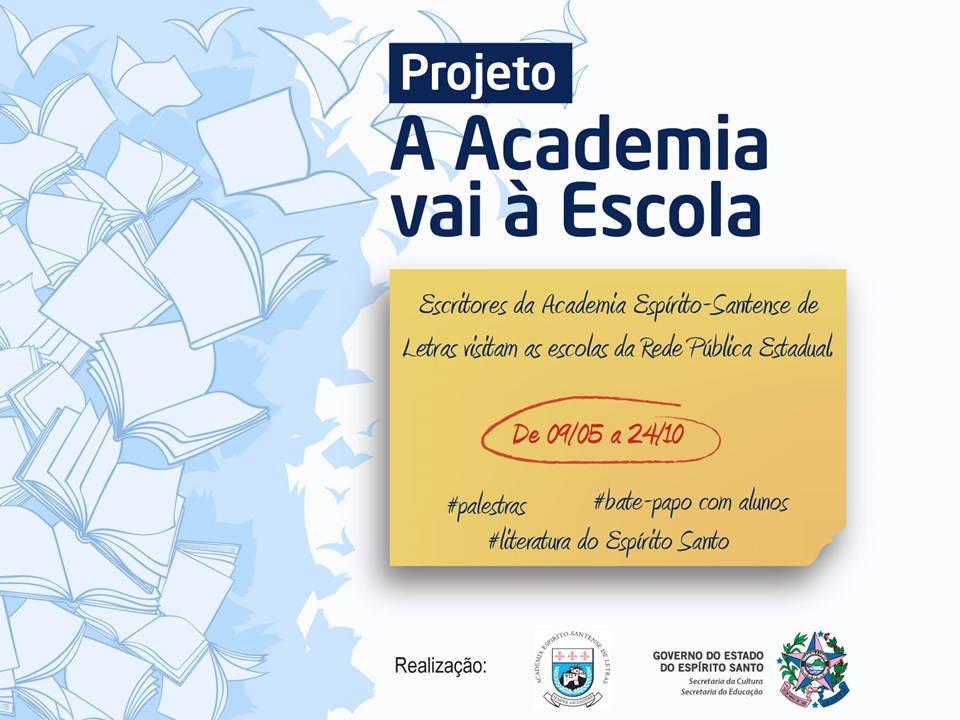 Boa notícia para a literatura produzida no Espírito Santo: de maio a outubro deste ano os escritores da Academia Espírito-Santense de Letras vão realizar uma série de 20 palestras nas escolas da Rede Pública Estadual, dentro do projeto ‘A Academia vai à Escola’. O projeto é uma realização da Secretaria de Estado da Cultura (Secult) em parceria com a Secretaria de Estado da Educação (Sedu) e a Academia Espírito-Santense de Letras.