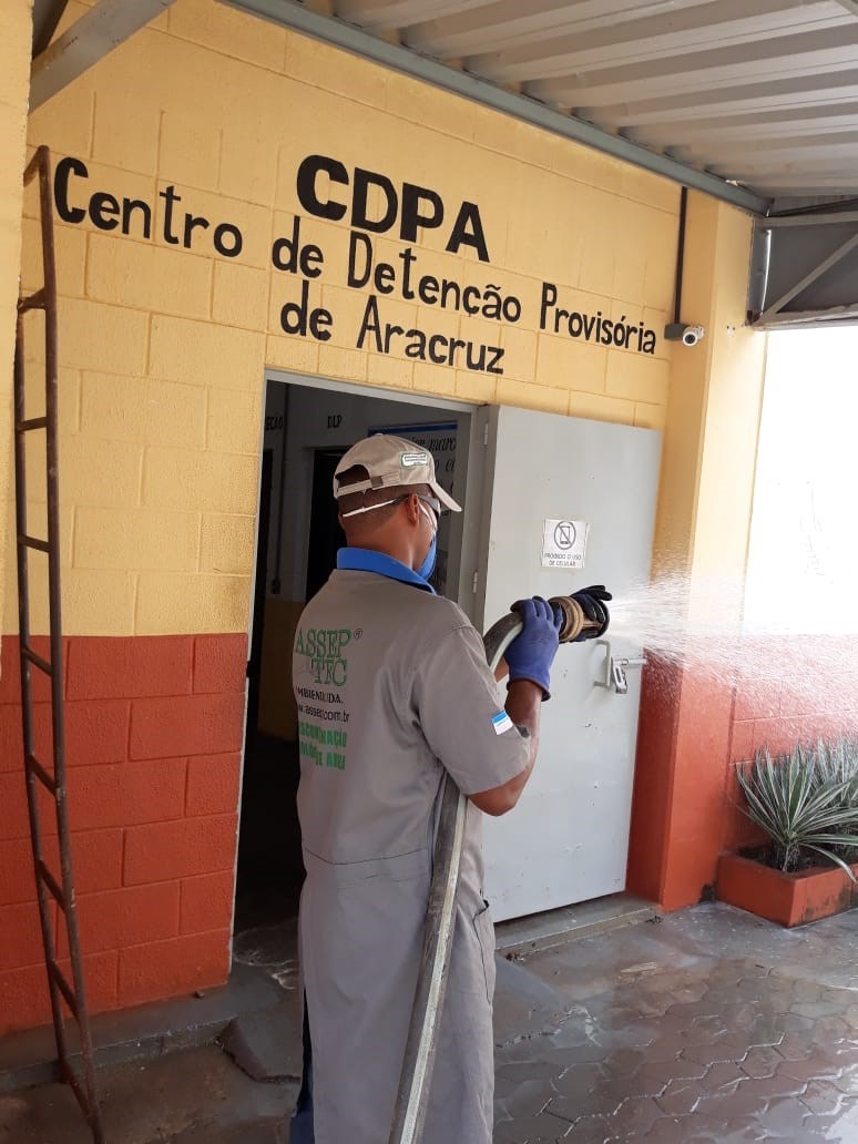 O Centro de Detenção Provisória de Aracruz (CDPA) passou por processo de limpeza e desinfecção nesta quinta-feira (06). A ação visa ao combate ao novo Coronavírus (Covid-19) e o controle a focos de mosquitos transmissores de diversas doenças. Galerias, celas, setores administrativos e área externa passaram pela desinfecção.