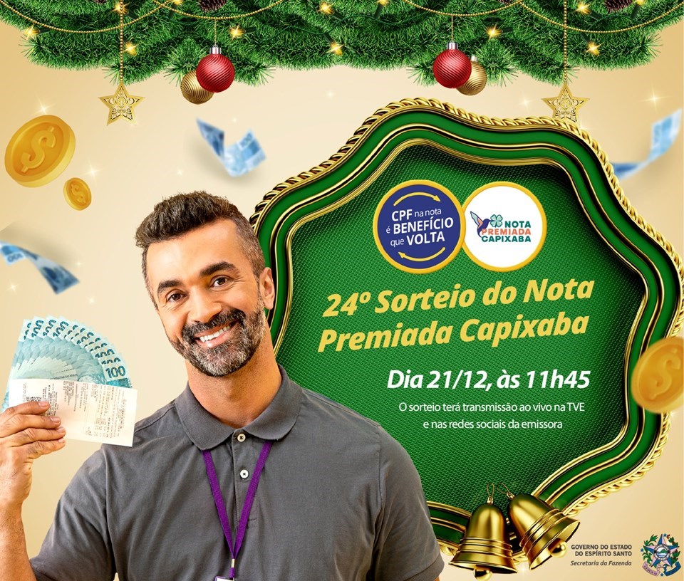 Que tal ganhar um presentão de Natal? O último sorteio do ano do Nota Premiada Capixaba foi antecipado e acontece nesta quinta-feira (21), com transmissão ao vivo, às 11h45, pela TVE Espírito Santo e pelo canal da emissora no YouTube. Serão sorteados 12 prêmios, com valores entre R$ 2,5 mil e R$ 20 mil.