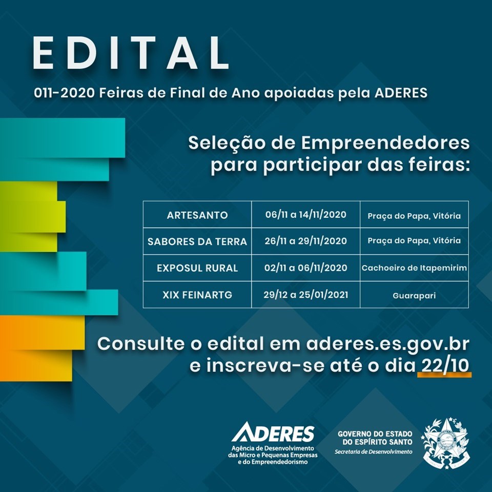 A Agência de Desenvolvimento das Micro e Pequenas Empresas e do Empreendedorismo do Estado (Aderes), abriu edital de seleção para empreendedores interessados em expor e vender seus produtos nas feiras comerciais que acontecem no fim de ano.