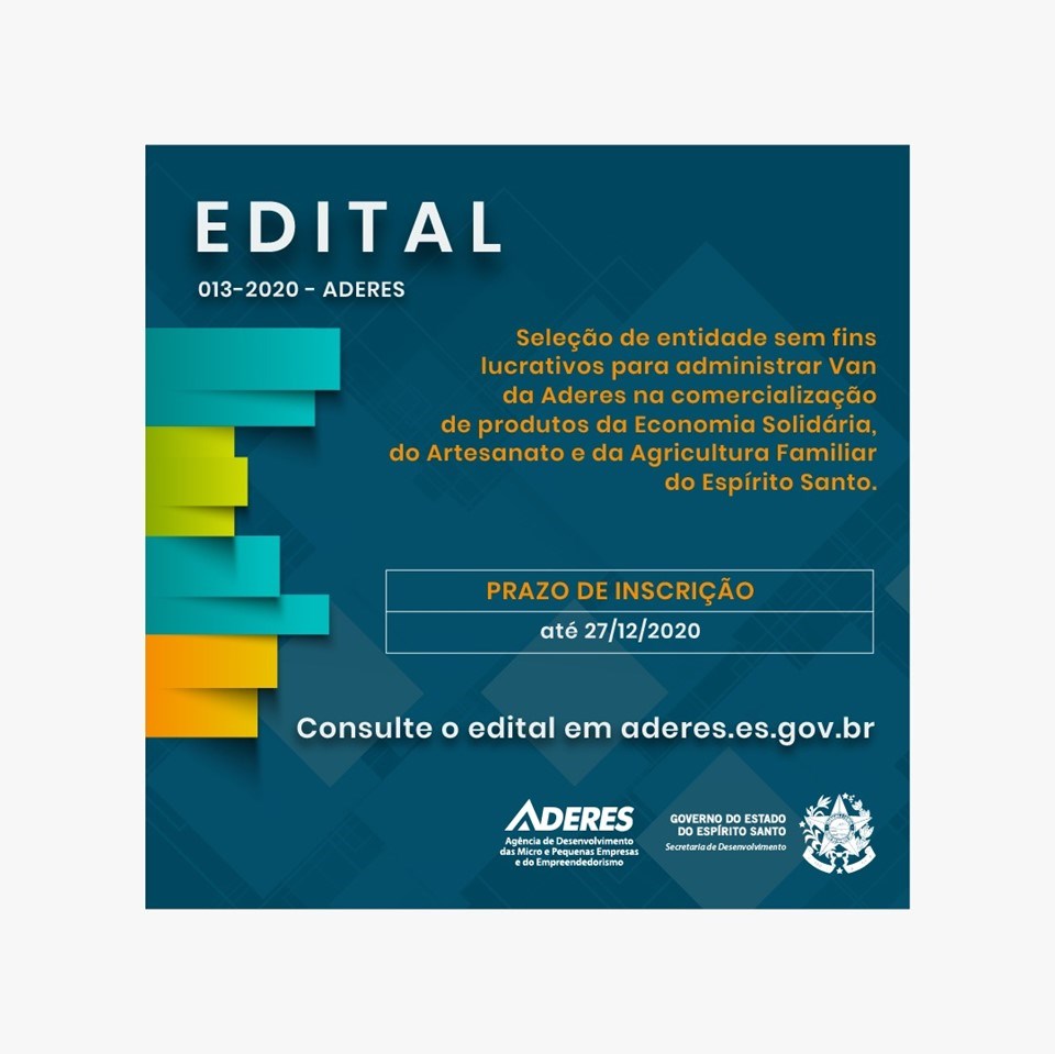 A Agência de Desenvolvimento das Micro e Pequenas Empresas e do Empreendedorismo do Estado (Aderes) abriu edital de chamamento público com objetivo de selecionar instituição para administrar uma unidade móvel, que vai divulgar e comercializar produtos dos empreendimentos da Economia Solidária, Agricultura Familiar e Artesanato Capixaba, com o propósito de gerar renda para os pequenos negócios.