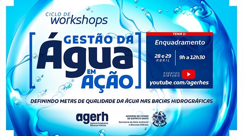 A Agência Estadual de Recursos Hídricos (Agerh) vai realizar, nas manhãs das próximas quarta-feira (28) e quinta-feira (29), o workshop virtual de Enquadramento. O tema vai abrir o Ciclo de Workshops “Gestão da Água em Ação”, promovido pelo órgão gestor de recursos hídricos do Espírito Santo para compartilhar experiências e abordagens práticas sobre assuntos que permeiam o gerenciamento da água no Estado e no País.
