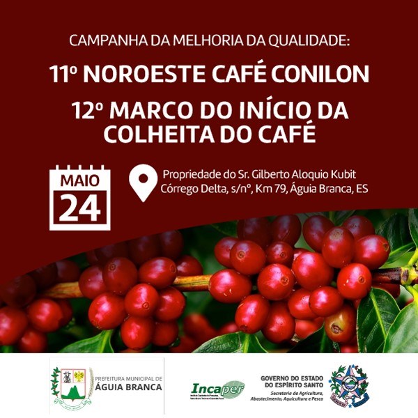 A sustentabilidade diante dos desafios da cafeicultura do conilon será o tema que vai nortear os trabalhos do maior evento da cafeicultura capixaba, promovido pelo Instituto Capixaba de pesquisa, Assistência Técnica e Extensão Rural (Incaper) e parceiros. As solenidades alusivas ao 12° Marco do Início da Colheita do Café e o 11° Noroeste Café Conilon serão realizadas na próxima sexta-feira (24) na propriedade do Sr. Gilberto Aloqui Kubit, em Córrego Delta, s/nº, Km 79, no município de Águia Branca, na região noroeste do Espírito Santo.