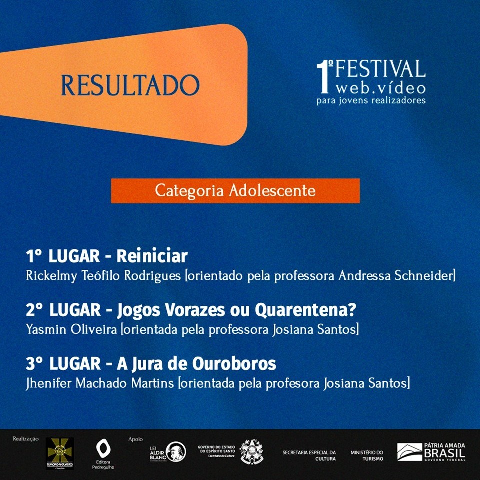 Três alunos e duas professoras da Rede Estadual foram os vencedores do Festival Web.vídeo para Jovens Realizadores. O evento on-line contou com quase 100 trabalhos enviados por jovens e adolescentes de todo o Estado. As premiações ocorreram na categoria Adolescente e foram avaliadas por um júri técnico composto por profissionais de cinema, cultura e educação.