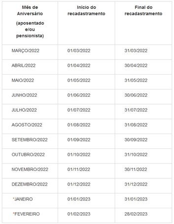 Abaixo, confira a tabela referente ao período em que os segurados devem se recadastrar.