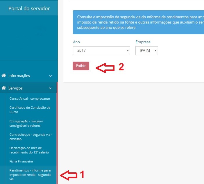 Em seguida, aparecerá a tela abaixo (III), e o segurado deve acessar Serviços, no menu à esquerda, e clicar no item referente ao Informe de Rendimento, de acordo com imagem IV. Por fim, pressionar o botão “exibir” para poder visualizar a declaração, e também, caso queira, imprimí-la.