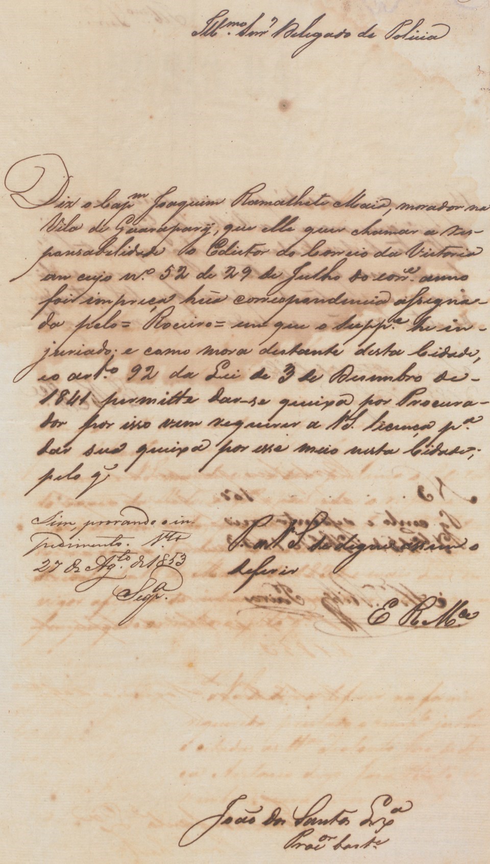 Uma vez que Maia morava na Villa de Guarapary, ele solicita que a denúncia seja feita por procuração em nome de João dos Santos Lisboa, pois os inquéritos, comumente, se desenrolavam na capital da Província do Espírito Santo, Vitória. Segundo consta no processo, o impedimento em fazê-lo pessoalmente estava provado, pois ele se encontrava distante “12 léguas da cidade”, sendo esse um caso que o autorizava requerer tal licença.
