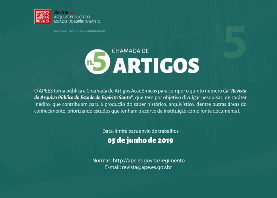 O Arquivo Público do Estado do Espírito Santo (APEES) torna pública a chamada de artigos acadêmicos para compor o quinto número da “Revista do APEES”. O prazo para submissão de trabalhos vai até o dia 05 de junho, que devem ser de caráter inédito. A publicação tem periodicidade semestral e é disponibilizada no site oficial do órgão. As normas e o regimento para o envio dos trabalhos podem ser consultadas no sítio eletrônico: www.ape.es.gov.br/regimento.