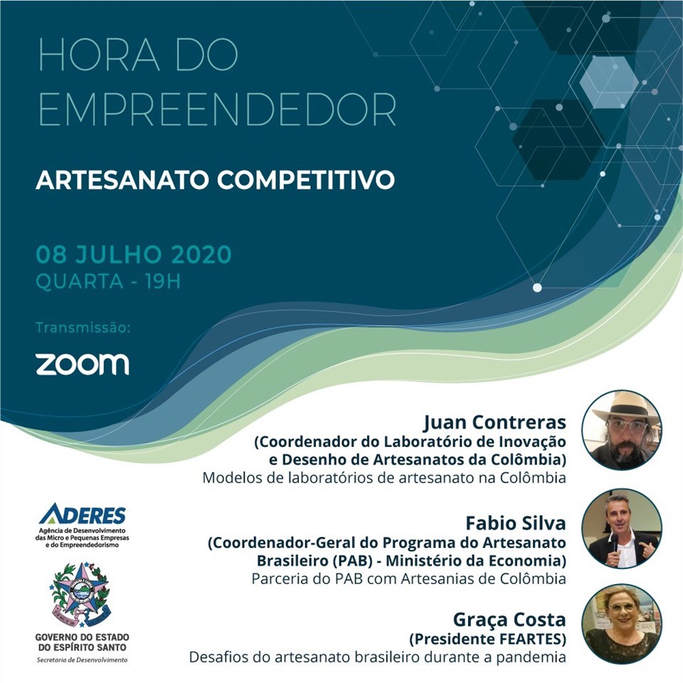 Empreendedores do artesanato capixaba se reúnem nesta quarta-feira (08), durante o “Hora do Empreendedor”, transmitido por meio de webconferência, com o objetivo de debater o tema “Artesanato Competitivo”. O encontro é o segundo de uma série que a Agência de Desenvolvimento das Micro e Pequenas Empresas e do Empreendedorismo (Aderes) promove para os donos de pequenos negócios. O evento acontece das 19 horas às 20 horas, por meio da plataforma Zoom. Os interessados devem fazer inscrição gratuita, no link https://bit.ly/3dVg8wQ.