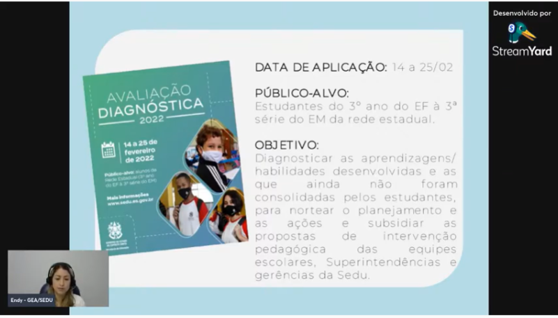 Nessa quinta-feira (10), a Sedu, por meio da Subsecretaria de Planejamento e Avaliação, realizou uma live para alinhamentos necessários à aplicação da Avaliação e apresentou as Diretrizes Diagnósticas 2022 aos profissionais da educação da Rede Estadual.
