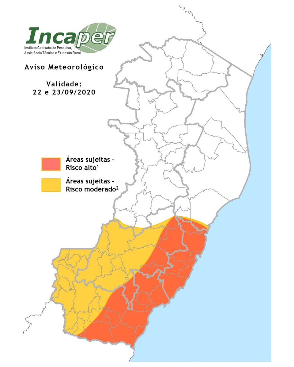 A Coordenação de Meteorologia do Instituto Capixaba de Pesquisa, Assistência Técnica e Extensão Rural (Incaper), por meio do Aviso Meteorológico Especial, informa nível de atenção devido às condições meteorológicas favoráveis para a previsão de pancadas de chuvas localmente fortes a partir desta terça-feira (22). As chuvas virão acompanhadas de descargas atmosféricas e rajadas de vento, podendo ocasionar acumulados significativos de precipitação em alguns trechos do Estado, que apresentam risco alto ou moderado, conforme mostra a figura.