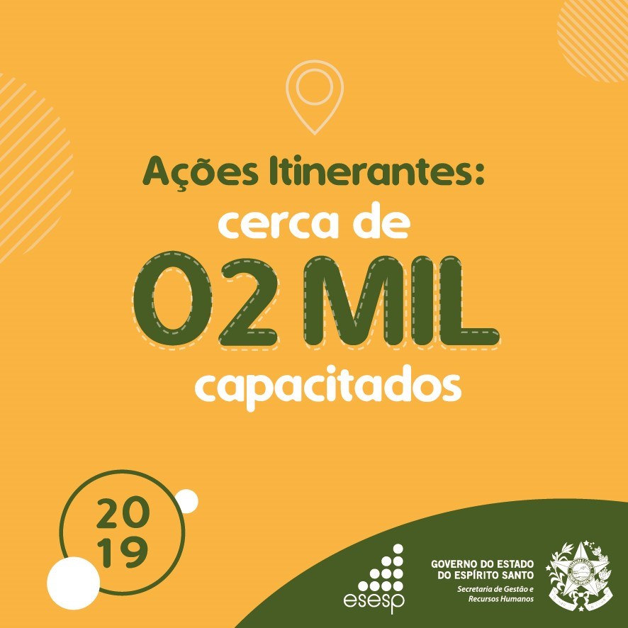 A Escola de Serviço Público do Espírito Santo (Esesp) contribuiu ativamente para o desenvolvimento profissional e pessoal de servidores municipais ao longo de 2019. Somando todas as ações itinerantes promovidas durante o ano, a instituição registrou a participação de cerca de dois mil profissionais nos eventos educacionais realizados em diversos municípios.