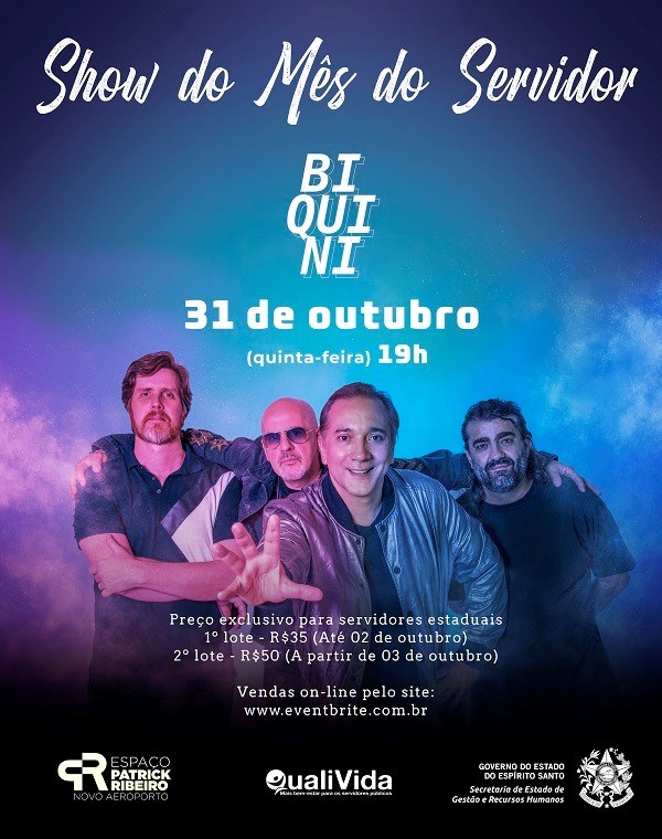 Muita música, animação e confraternização. É o que promete a parceria da Secretaria de Estado de Gestão e Recursos Humanos (Seger) com a Patrick Ribeiro Produções para a programação do Mês do Servidor, celebrado em outubro. A empresa trará ao espaço de eventos do aeroporto de Vitória o show da banda de rock nacional Biquini Cavadão.