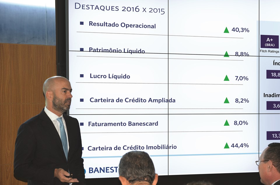 O Banco do Estado do Espírito Santo (Banestes) realizou reunião pública, na manhã dessa quarta-feira (22), para divulgar os resultados do exercício de 2016. O Lucro Líquido atingiu a cifra de R$ 161,4 milhões, montante 7,0% superior em comparação a 2015. Os números demonstram a contínua melhoria do desempenho econômico e financeiro do Banco, mesmo diante do cenário desafiador que enfrenta o país.