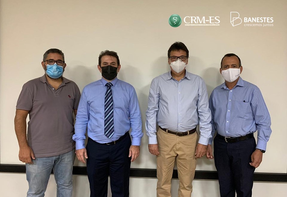 Para a assinatura do convênio estiveram presentes, na sede do CRM-ES, o diretor-presidente do Banestes, José Amarildo Casagrande; o diretor de Rede do Banestes, Fernando Valli Cardoso; o presidente do CRM-ES, Dr. Fabrício Otávio Gaburro Teixeira; e o vice-presidente do CRM-ES, Dr. Aron Stephen Toczek Souza.