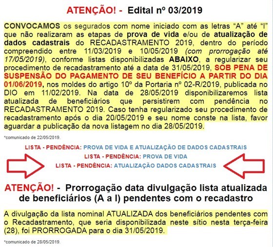 Ainda de acordo com a coordenadora do Recadastramento, “nesta sexta-feira (31), o Instituto divulgará na página da autarquia uma nova listagem dos beneficiários que persistiram com pendência no recadastro”.