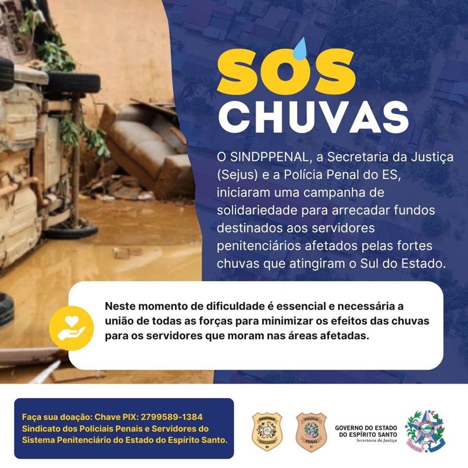A Secretaria da Justiça (Sejus) e a Polícia Penal do Espírito Santo (PPES), em parceria com o Sindicato dos Policiais Penais e Servidores do Sistema Penitenciário do Estado do Espirito Santo (SINDPPENAL), deram início à campanha de solidariedade para arrecadar fundos destinados aos servidores penitenciários afetados pelas fortes chuvas que atingiram o sul do Estado.