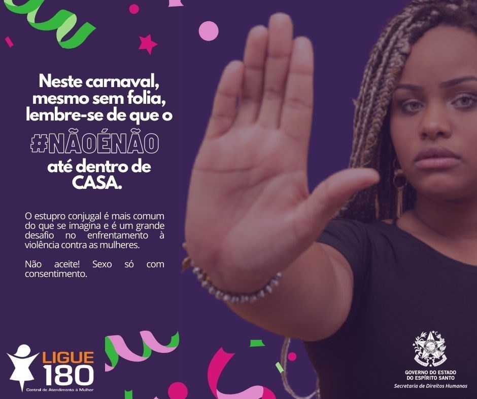“Neste Carnaval, mesmo sem folia, o #NãoéNão até dentro de casa”, é o que diz a campanha. Ela é baseada no incentivo ao respeito no relacionamento, abordando o estupro conjugal como um grande desafio no enfrentamento da violência contra as mulheres.