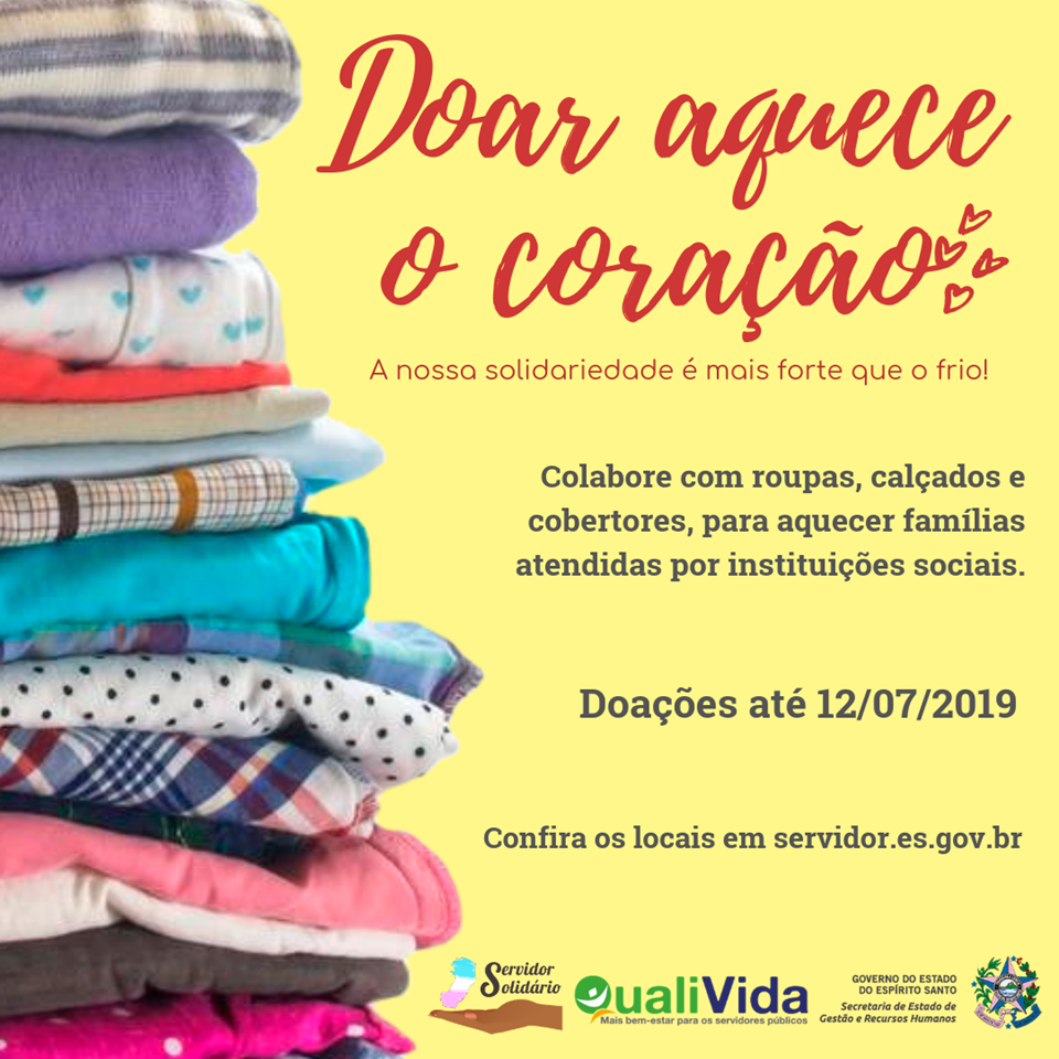 Vinte e um órgãos e entidades do Governo do Estado aderiram à Campanha do Agasalho 2019: Doar Aquece o Coração. E para que mais servidores tenham chance de participar, o prazo para as doações foi estendido até esta sexta-feira (12). O objetivo é arrecadar roupas, calçados, agasalhos e cobertores, que serão doados a instituições sociais sem fins lucrativos. A lista dos locais para entrega das doações pode ser conferida no portal www.servidor.es.gov.br.