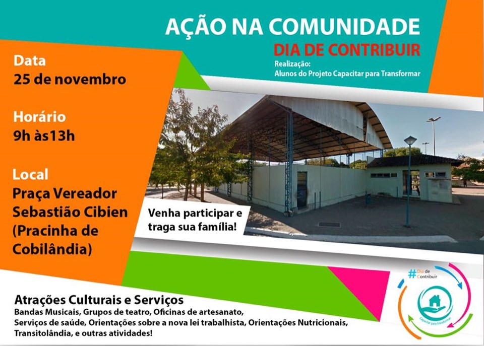 Neste sábado (25), em Vila Velha, a segunda turma do ‘Capacitar para Transformar’ concluirá a participação com uma formatura diferente: eles vão levar até a Praça Vereador Sebastião Cibien, em Cobilândia, uma ação cultural e lúdica para a comunidade. O encontro está previsto para começar às 9 horas e ser encerrado às 13 horas, com uma programação recheada de atrações e serviços.