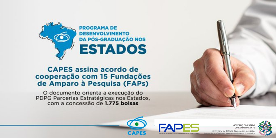 A Fundação de Amparo à Pesquisa e Inovação do Espírito Santo (Fapes) assinou um acordo de cooperação com a Coordenação de Aperfeiçoamento de Pessoal de Nível Superior (Capes) e a fundação do Ministério da Educação (MEC), para a execução do Programa de Desenvolvimento da Pós-Graduação (PDPG) Parcerias Estratégicas nos Estados.
