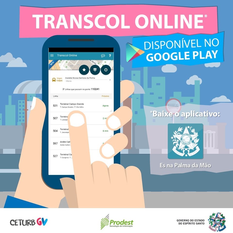 Os capixabas já podem conferir pelo celular, em tempo real, a previsão de chegada dos ônibus do Transcol nos pontos da Grande Vitória. Isso porque o Transcol Online já está disponível na versão Android do aplicativo ES na Palma da Mão, desenvolvido pelo Instituto de Tecnologia da Informação e Comunicação do Estado do Espírito Santo (Prodest).