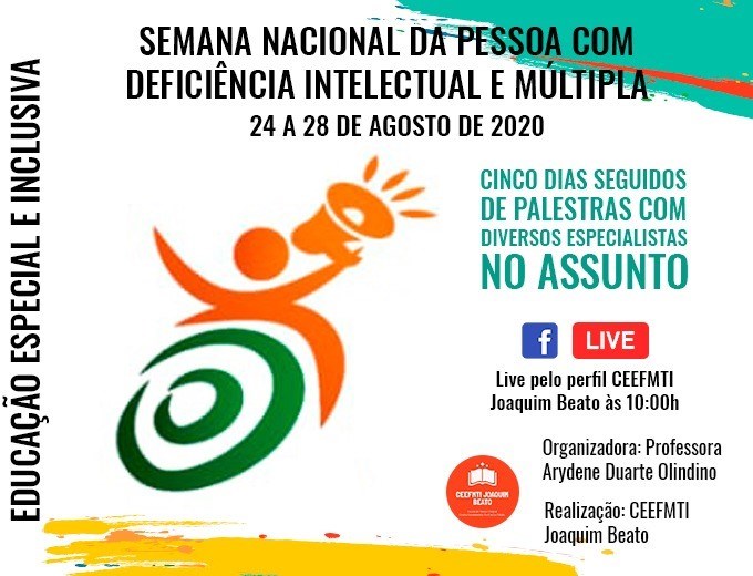 O Centro Estadual de Ensino Fundamental e Médio em Tempo Integral (CEEFMTI) Joaquim Beato, localizado na Serra, realiza, entre os dias 24 e 28 de agosto, a “Semana Nacional da Pessoa com Deficiência Intelectual e Múltipla”. Serão cinco dias de palestras com diversos especialistas. Os webinários serão transmitidos pelo Facebook da escola (clique aqui), a partir das 10 horas.