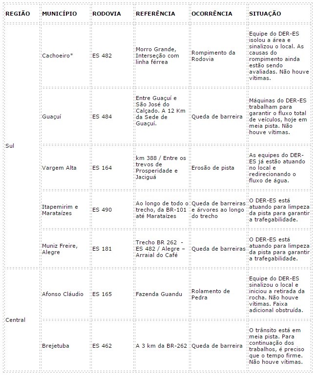 Rio Novo do Sul: Segundo o Coordenador da Compdec, Sr. Paulo, uma enxurrada atingiu o município, obstruindo várias vias e acesso à região Serrana e Interior. Além disso, a BR 101 encontra-se interditada entre os km 384 e 390 devido a deslizamentos de terra.