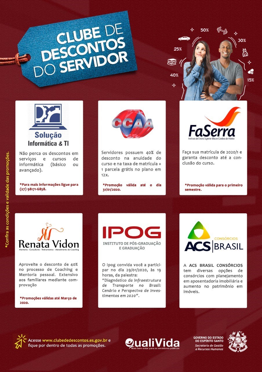 Os parceiros do Clube de Descontos do Servidor estão oferecendo, neste mês de janeiro, condições especiais aos profissionais do Executivo Estadual em diversos serviços e produtos. Para consultar os benefícios, basta acessar o site www.clubededescontos.es.gov.br.
