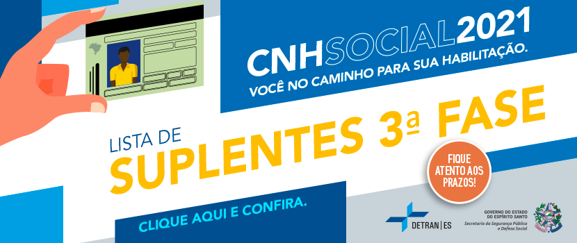 O Departamento Estadual de Trânsito do Espírito Santo (Detran|ES) divulgou nesta quinta-feira (02), às 12h, a lista única de suplentes selecionados na 3ª fase do programa CNH Social 2021. Ao todo, 489 candidatos inscritos terão a oportunidade de obter a primeira habilitação, adicionar ou mudar a categoria após a desclassificação dos candidatos selecionados na primeira chamada que não respeitaram os prazos estabelecidos no processo de Habilitação. O objetivo é preencher o máximo de vagas e beneficiar mais cidadãos capixabas com a Carteira Nacional de Habilitação (CNH) gratuita.