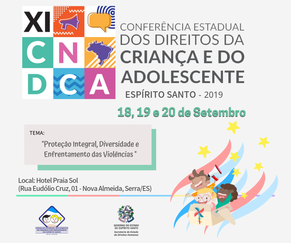 Para tratar dos direitos das crianças e adolescentes do Espírito Santo e traçar propostas para as políticas públicas em âmbito municipal e estadual, especialmente no que diz respeito ao enfrentamento das diversas formas de violência, acontece, entre os dias 18 e 20 de setembro, a XI Conferência Estadual dos Direitos da Criança e do Adolescente. O evento é promovido pela Secretaria Estadual de Diretos Humanos (SEDH) e pelo Conselho Estadual dos Direitos da Criança e do Adolescente (Criad) e acontece no Hotel Praia Sol, localizado em Nova Almeida, na Serra.