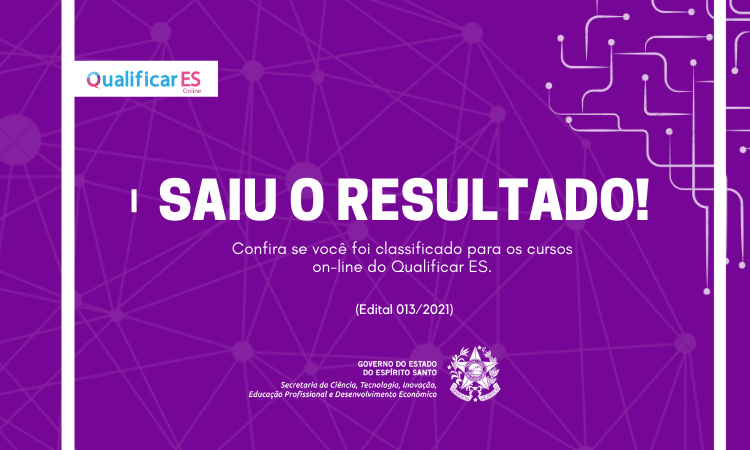 O resultado está disponível no site www.qualificar.es.gov.br (Edital 013/2021). Os candidatos foram selecionados de acordo com a ordem de inscrição até o preenchimento total do número de vagas de cada curso.