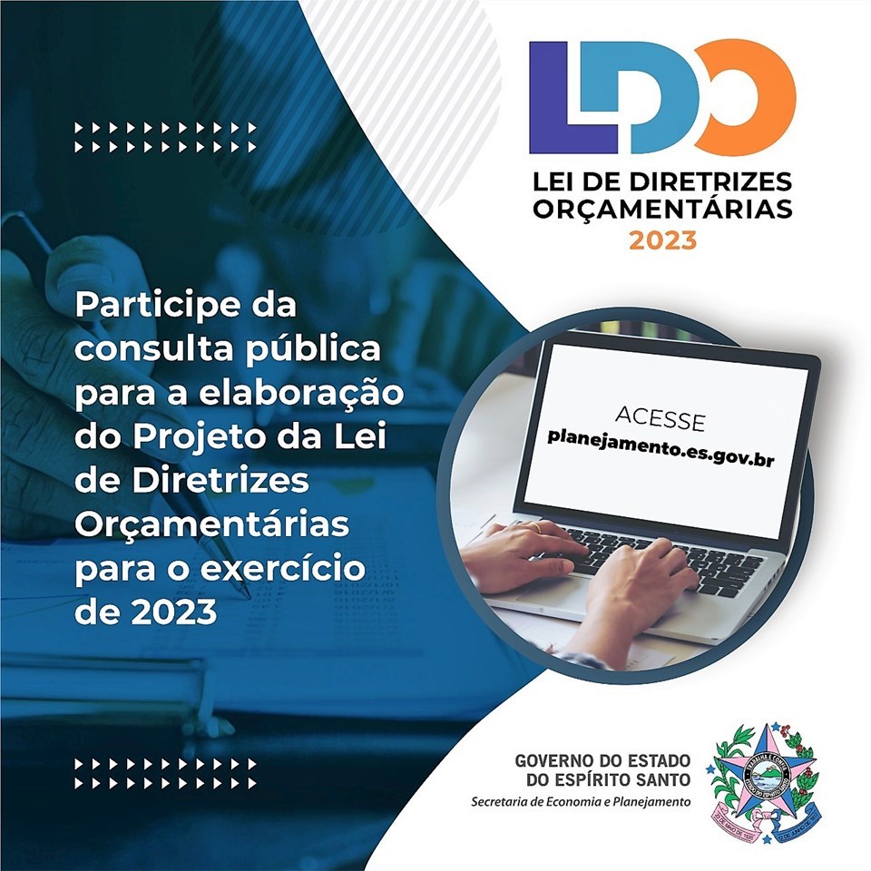 A consulta pública para a elaboração do Projeto da Lei de Diretrizes Orçamentárias (PLDO) do Governo do Espírito Santo, para o exercício de 2023, será encerrada nesta sexta-feira (25). Para participar, basta que o cidadão acesse o site www.planejamento.es.gov.br, da Secretaria de Economia e Planejamento (SEP).