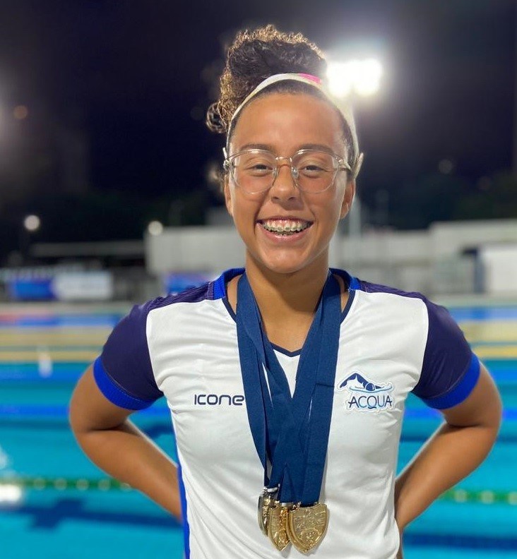 Tyara Ramos, que compete na categoria Juvenil 1, conquistou três medalhas de ouro, nas provas de 400m livres, 100m costas e 200m medley, além de uma medalha de prata, nos 100m livres. Feliz com os resultados, a nadadora exaltou as vitórias que teve e comentou sobre a expectativa de disputar o Campeonato Brasileiro da modalidade