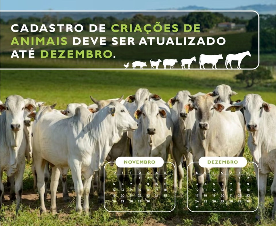 Entre os dias 1º de novembro e 31 de dezembro, os produtores rurais do Espírito Santo deverão fazer a atualização cadastral de rebanhos, que inclui bovinos, bubalinos, caprinos, ovinos, equinos, asininos, muares, suínos e aves de subsistência, animais aquáticos e abelhas.