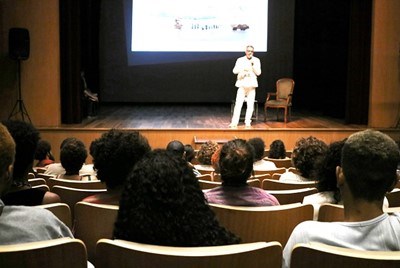 O artista, curador e professor baiano Ayrson Heráclito foi o convidado do Módulo I: Arte, Sociopolítica e Corporeidades, encontro que integra o Programa de Pesquisa e Formação da Galeria Homero Massena. O evento aconteceu nessa segunda-feira (22), no Palácio da Cultura Sônia Cabral, no Centro de Vitória.
