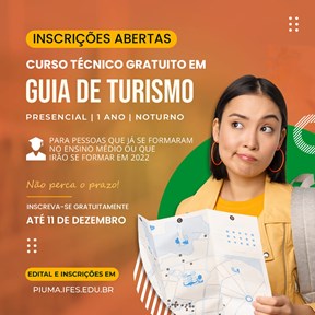 Resultado de um trabalho coletivo do setor de turismo, com o apoio do Governo do Estado, por meio da Secretaria de Turismo, o Instituto Federal de Educação, Ciência e Tecnologia do Espírito Santo (Ifes) – Campus de Piúma vai realizar o curso técnico gratuito de Guia Turismo. Ao todo, são 40 vagas e a inscrição pode ser feita até o próximo dia 11 de dezembro, de forma on-line ou presencialmente no Campus Piúma.