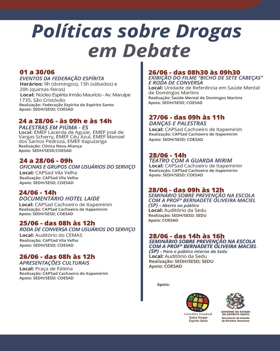 Com a temática “Política Sobre Drogas em Debate: Drogas e Direitos Humanos”, a Secretaria de Estado de Direitos Humanos (Sedh), por meio da Subsecretaria Estadual de Políticas Sobre Drogas (Sesd) e do Conselho Estadual sobre Drogas (Coesad), realizará, entre os dias 24 e 28 de junho, a Semana Estadual sobre Drogas.