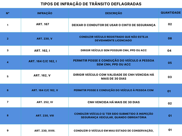 No total, 103 veículos foram abordados, sendo: 35 automóveis, 60 motocicletas e 11 transportes escolares. Além disso, 27 Autos de Infrações de Trânsito (AITs) foram registrados por motivos diversos e sete veículos foram removidos para o pátio, por pendências administrativas no sistema do Detran|ES. Um dos veículos removido foi um escolar em mau estado de conservação, com pneus carecas, sem o selo da vistoria de inspeção semestral obrigatória para este tipo de transporte e também, com o licenciamento anual vencido.