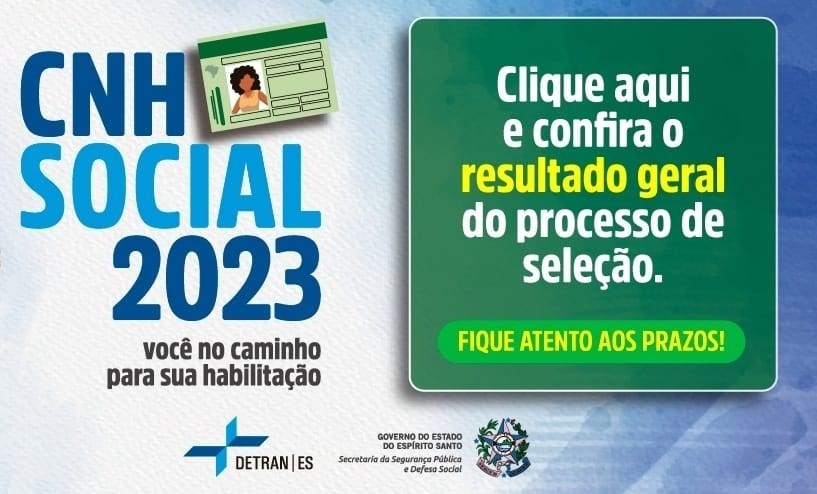O Departamento Estadual de Trânsito do Espírito Santo (Detran|ES) apresentou, nesta quinta-feira (20), a lista com os nomes dos 3.500 selecionados na 1ª fase do programa CNH Social de 2023. O resultado está publicado no site www.detran.es.gov.br, em banner localizado na página principal, e a matrícula on-line, obrigatória para garantir a continuidade no processo, já está disponível para os candidatos que foram selecionados. O prazo para o beneficiário realizar este procedimento segue aberto até às 23h59 do próximo dia 05 de maio.