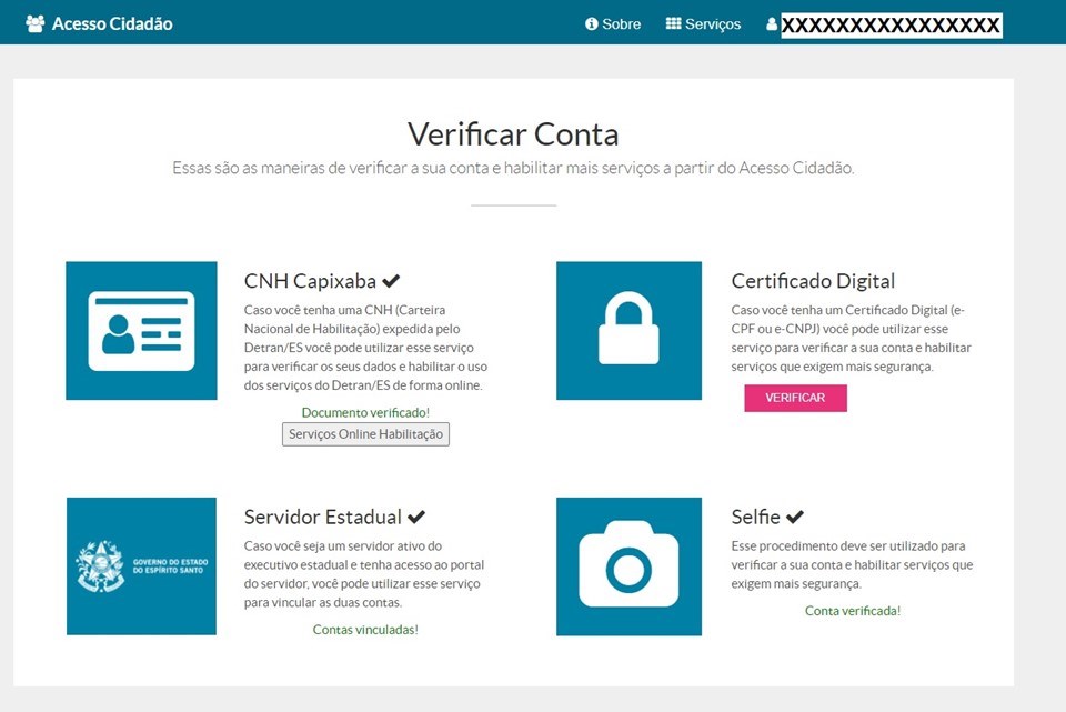 Após estar logado no portal, o cidadão deverá clicar no seu nome, que fica no canto superior direito e acessar o ícone “Verificar conta”. Ao clicar, abrirá uma página em que será possível identificar quatro possibilidades de fazer a verificação da conta: Servidor Estadual, Certificado Digital, CNH Capixaba e Selfie. O Detran|ES recomenda esses dois últimos, por serem mais simples e acessíveis.