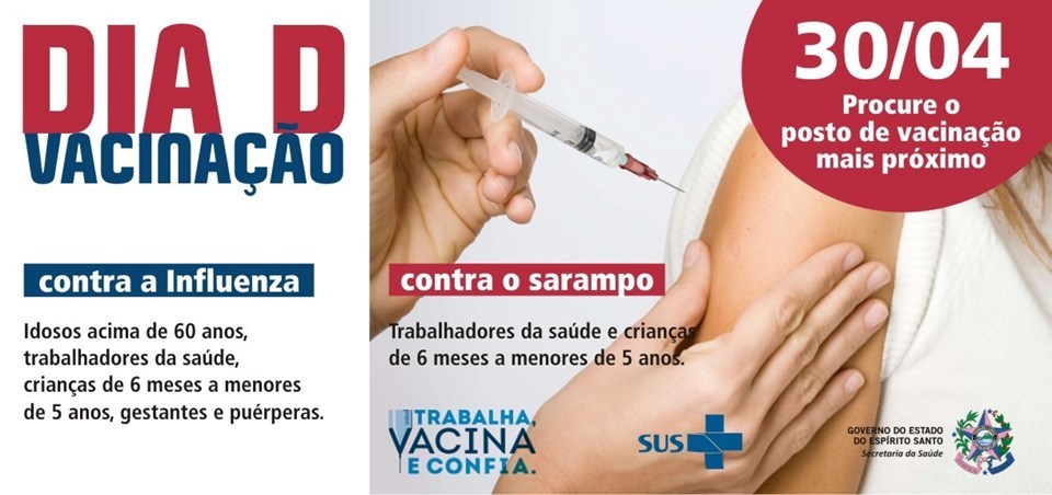 O próximo sábado (30) será marcado por duas importantes etapas de intensificação da vacinação em todo o Brasil, com o Dia D de mobilização social referente à 24ª Campanha Nacional de Vacinação contra a Influenza e à 8ª Campanha Nacional de Seguimento e Vacinação de Trabalhadores da Saúde contra o Sarampo. No Espírito Santo, o Dia D marca oficialmente também o início da imunização de novos grupos, com a antecipação de crianças de seis meses a menores de cinco anos para as duas campanhas e a de gestantes e puérperas para a Influenza.